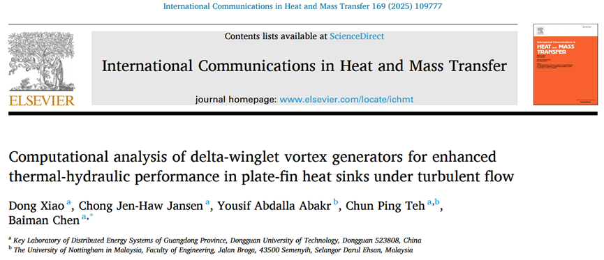 2023级能源动力硕士研究生肖东以第一作者在国际知名期刊《International Communications in Heat and Mass Transfer》(中科院2区)上发表题为“Computational analysis of delta-winglet vortex generators for enhanced thermal-hydraulic performance in plate-fin heat sinks under turbulent flow”的创新研究成果,陈佰满教授为通讯作者,欧乐影院