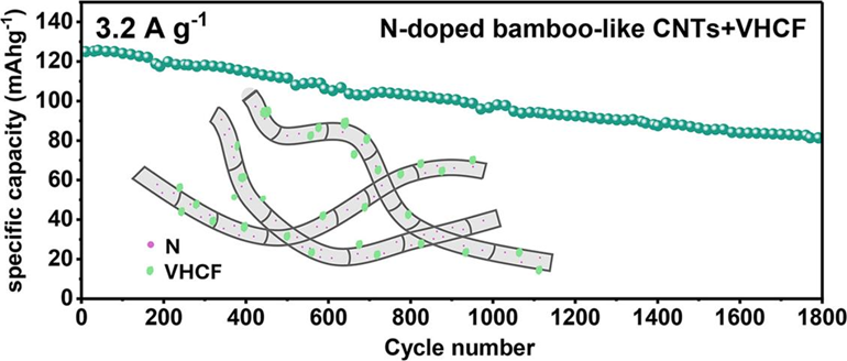 为第一完成单位。研究团队创新性地将铁氰化钒与不同结构的碳纳米管复合,探究了碳纳米管的氮掺杂特性与结构特征在提升铁氰化钒基水溶液锌离子电池性能中的关键作用。电池测试结果显示,引入碳纳米管可有效提升电极材料的比容量与循环稳定性。机理分析进一步表明,氮掺杂有助于增强充放电反应动力学过程,从而提高比容量;而竹节状与鱼骨状结构不仅能提供额外的机械支撑,也为Zn²⁺嵌入提供了更多活性位点,有利于提高电池比容量,同时延长循环使用寿命。该研究为开发柔性水系锌离子电池的碳基正极材料设计提供了重要的材料支持和理论依据。